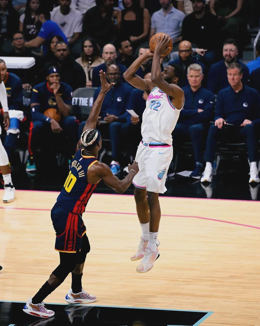 2024-25赛季常规赛,维金斯在热火场均19分4.2篮板3.3助攻1.2抢断1盖帽2.5失误,三项命中率:45.8%,36%,73.1%。今年季后赛,他场均11.5分3.3篮板2.3助攻0.3抢断1.3盖帽2.8失误,三项命中率:37.2%,35%,70%。