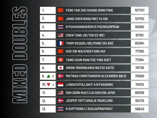 混双赛场依旧是国羽的优势项目,冯彦哲/黄东萍、蒋振邦/魏雅欣继续牢牢占据世界第一和第二的位置,双保险格局稳固。