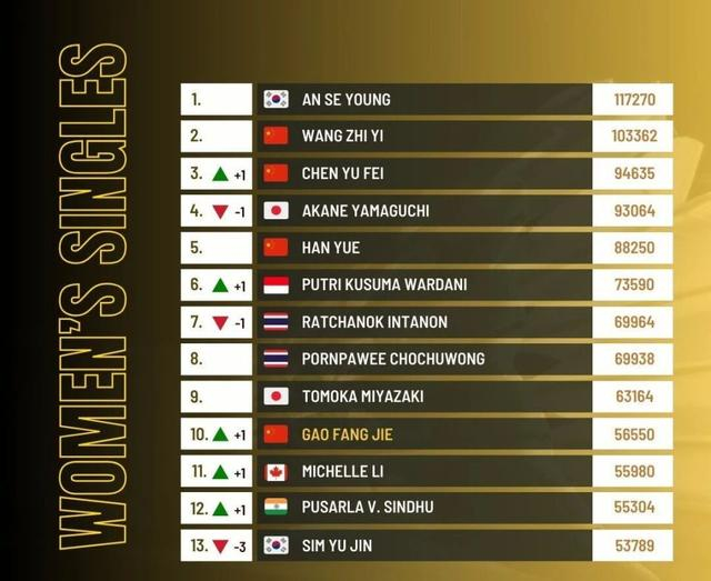 国羽其他选手表现稳定,王祉怡、韩悦排名保持不变,分别位列第2和第5名。另一位国羽选手高昉洁则凭借韩国选手沈有振,缺席赛事丢失去年亚军积分的机会,小升1位来到第10名,这也是她职业生涯的最高排名,期待她后续能稳步前行。