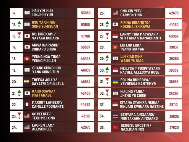 马来西亚组合陈堂杰/杜依蔚虽然排名仍为第4,但积分有所上升,竞争力持续在线。